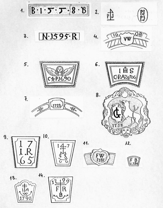 Ikonografia 104 a. Nowa Ruda, datowane szyldy z zabytkowej zabudowy historycznego ośrodka miejskiego, XVI–XVIII w. Szyldy i kamieniarka z inskrypcjami w: 1) z sieni domu nr 1 przy ul. Kościelnej, 2) z nie zidentyfikowanych domów rodziny Jenischów, 3) z oficyny domu nr 1 przy ul. A. Fredry, 4) z elewacji domu nr 9 przy ul. Podjazdowej (fragment portalu), 5) z elewacji domu nr 10 przy ul. Kościelnej (klucz portalu), 6) z elewacji domu rynkowego nr 6 (klucz portalu), 7) z nie istniejącej obecnie gospody (nr 21) przy ul. A. Fredry (fragment portalu), 8) z elewacji domu nr 23 przy ul. Cmentarnej (kartusz kupca Genedla), 9) z elewacji przebudowanego współcześnie domu nr 26 przy ul. Piastów (klucz portalu), 10) z nie istniejącego obecnie domu nr 4 przy ul. Łukowej (klucz portalu), 11) z elewacji domu nr 13 przy ul. Podjazdowej (fragment portalu), 12) z nieistniejącego obecnie domu nr 2 przy Pl. Grunwaldzkim (klucz portalu), 13) z elewacji domu nr 1 przy ul. Cmentarnej (klucz portalu), 14) z elewacji domu nr 23 przy ul. Piastów (klucz portalu). Zestawienie rysunków z: Wittig J., Chronik der Stadt Neurode, Neurode 1937