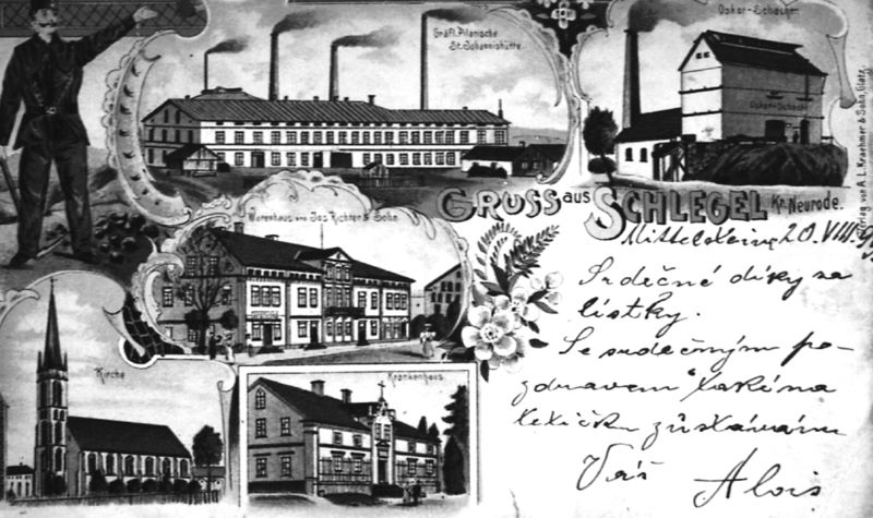 miejscowości, kościół (Kirche), szpital (Krankenhaus), dom towarowy we wsi (Warenhaus von Jos. Richters Sohn), huta szkła (Graf. Pilatische St. Johannishütte), szyb Oskar (Oskar Schacht), pocztówka (Gruss aus Schlegel) z 1899 r., ze zbiorów Muzeum Okręgowego w Wałbrzychu.