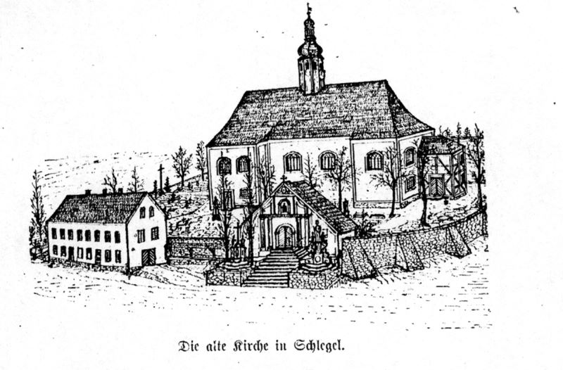 Ikonografia 138. Nowa Ruda-Słupiec, stary kościół parafialny (Die alte Kirche in Schlegel), reprodukcja rysunku z: Arnestuskalender, 1932.