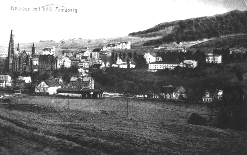 panorama fragmentu miasta ze stoku Sokolego Stoku ku południu (Neurode mit dem Annaberg), widoczne na