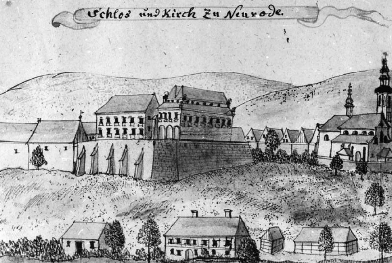 budynków łaźni miejskiej, widok od północnego zachodu (Schloss und Kirche zu Neurode), reprodukcja rysunku Wernhera. ze zbioru: Plany i widoki miast śląskich, przechowywanego w Muzeum Narodowym