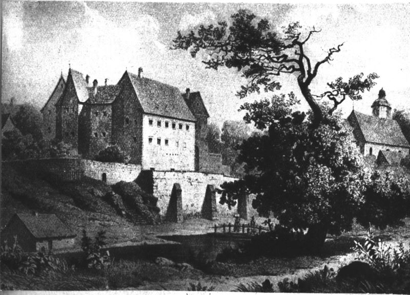 dziewiętnastowieczna wizja wyglądu średniowiecznego zamku (Das alte Neuroder Schloss in der Vorstellung eines Romantikers), reprodukcja grafiki z: Wittig J., Chronik der