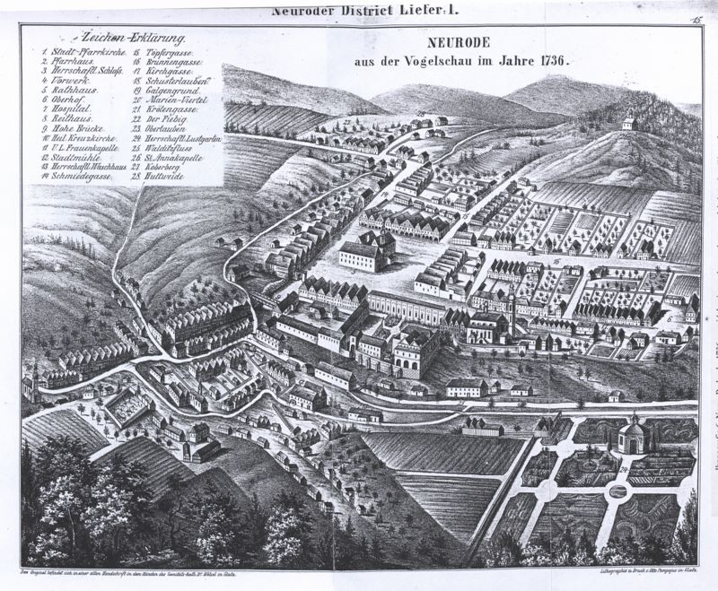 r., widok miasta z lotu ptaka (Neurode aus der Vogelschau im Jahre 1736), reprodukcja ryciny z: Album der Grafschaft Glatz oder Abbildungen der Städte, Kirchen, Kloster und Burgen derselben vor meist 150 Jahren[wyd. F.A. Pompejus], Glatz 1862.