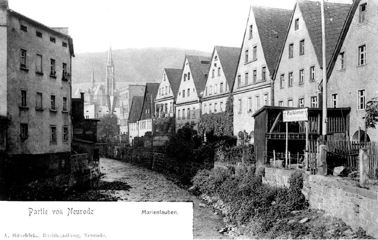 Ruda, nieistniejące obecnie domy podcieniowe przy ul. Łukowej, widok od strony Włodzicy(Partie von Neurode. Marienlauben), pocztówka z lat ok. 1920–1930 ze zbiorów Muzeum Narodowego we Wrocławiu