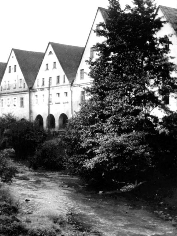Ikonografia 71. Nowa Ruda, nie istniejące obecnie domy podcieniowe od strony Włodzicy, stan z 1959 r., reprodukcja fotografii ze zbiorów Ośrodka Dokumentacji Zabytków w Warszawie. (fot. E. Falkowski)