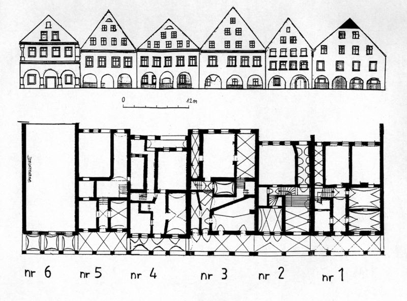 Ikonografia 79. Nowa Ruda, rzuty i elewacje nieistniejących obecnie domów przy ul. Łukowej (od strony Włodzicy), montaż inwentaryzacji elewacji domów (z 1961 r) oraz ich rzutów (1959), przechowywanych w archiwom SOZ Delegatury w Wałbrzychu.