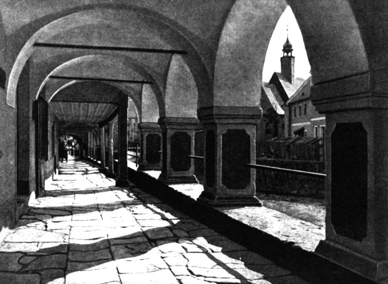 Nadrzeczna 5, podcienia, stan z okresu międzywojennego, widok ku południu, reprodukcja fotografii z: Wittig J., Chronik der Stadt Neurode, Neurode 1937.