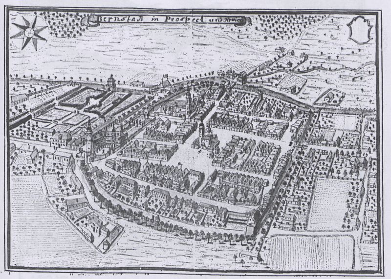 4. Bernstadt in Prospect und Revier. Widok miasta z lotu ptaka. Rysunek z: Werner F.B.: Topographia ... (op. cit.), p. IV - 694/695.