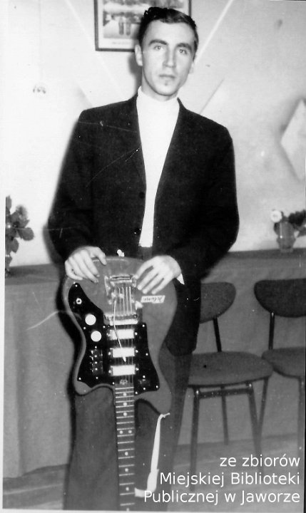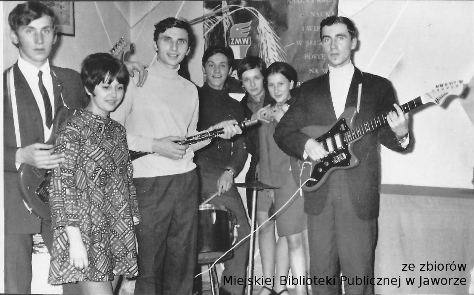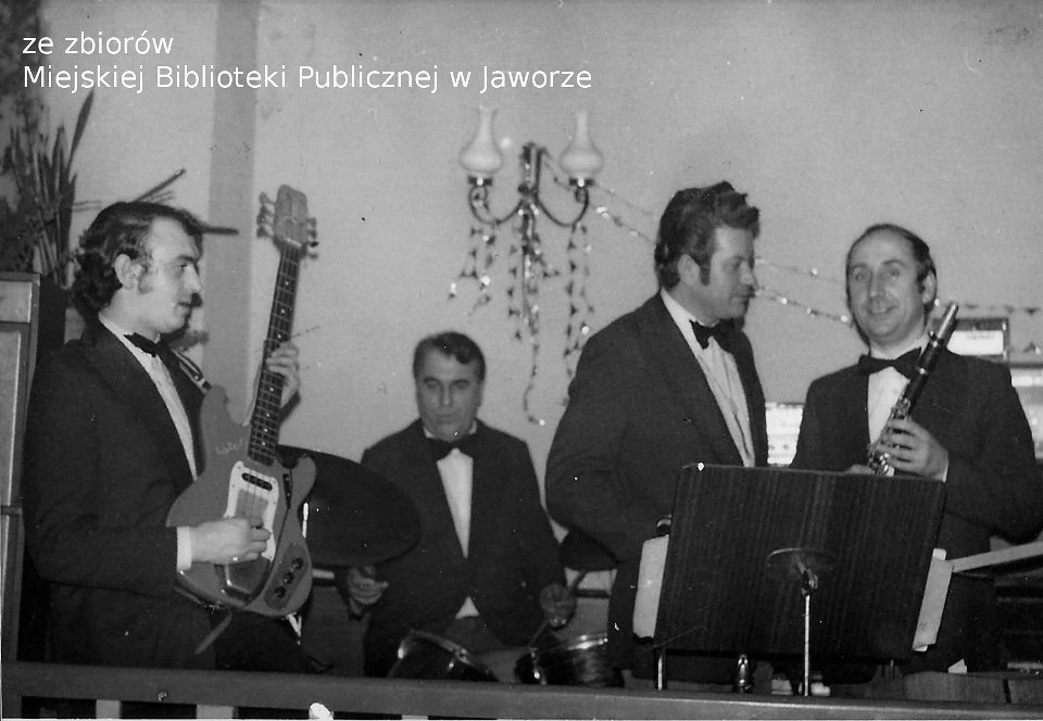 Od lewej strony, z instrumantami: Ryszard Kopeć (gitara), Stanisław Chodor (klarnet), Leszek Krajewski (perkusja), Zygmunt Dynowski (gitara)