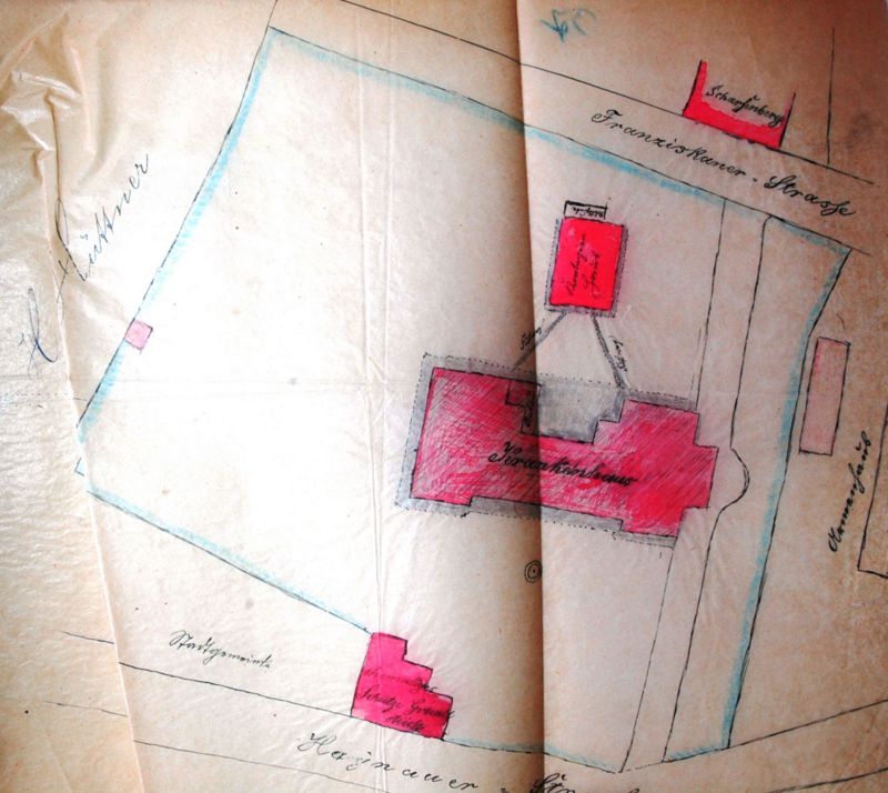 Tom II - Ilustracje -- 12. Legnica. Schemat rozmieszczenia budynków szpitala. Akta m. Legnica III 1274 p 37