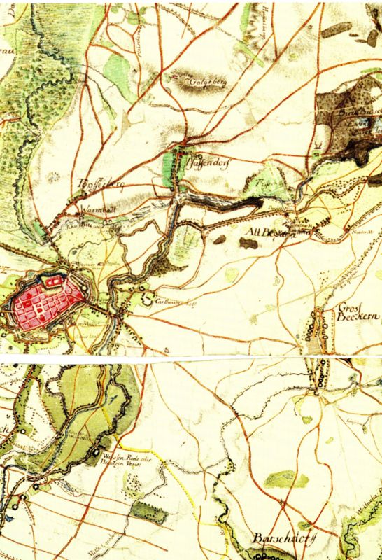 Tom II — ILUSTRACJE -- 2. Legnica. Fragment mapy okolic miasta, 1764-1770. Repr. za Atlas historyczny miast polskich, Tom IV Śląsk, Zeszyt 9 Legnica, plansza 20.