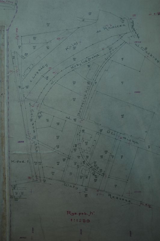 Tom II — ILUSTRACJE -- 23. Legnica. Fragment mapy katastralnej, rejon ul. Gliwickiej, ok. 1930, uzupełnienia nazw ulic po 1945. Archiwum Państwowe w Legnicy. Mapy i plany Legnicy.