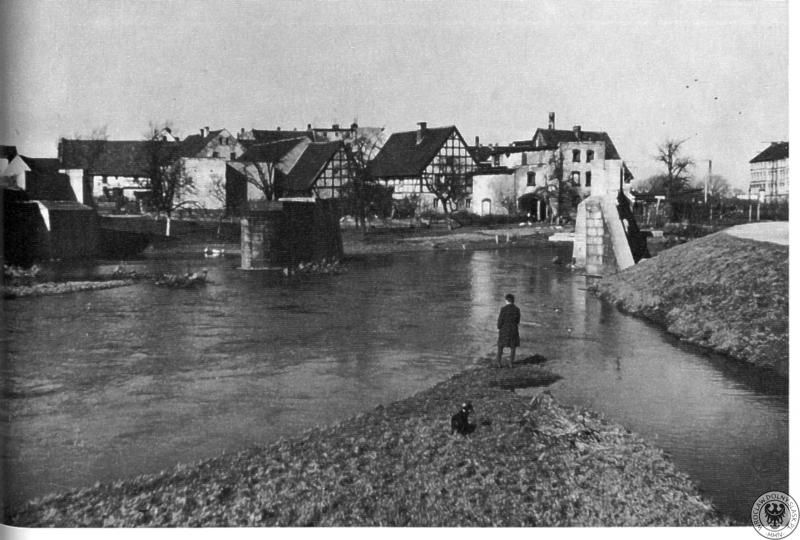 Tom II — ILUSTRACJE -- 80. Legnica. Głogowska — zabudowa nad Czarną Wodą przy ul. Rybackiej. Na pierwszym planie filary demontowanego mostu kolejowego. Fotografia z ok. 1920.