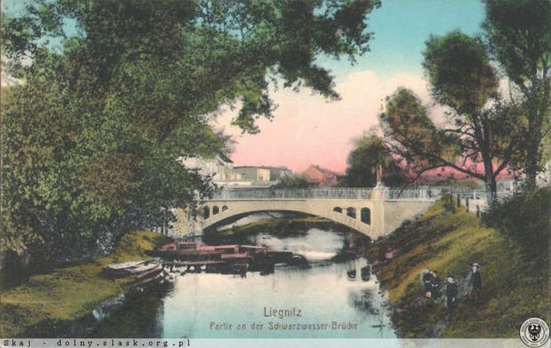 Tom II — ILUSTRACJE -- 107. Legnica. Głogowska — most na Czarnej Wodzie. Liegnitz. Partie an der Schwazwasser- Brücke. Karta pocztowa z pocz. XX w.