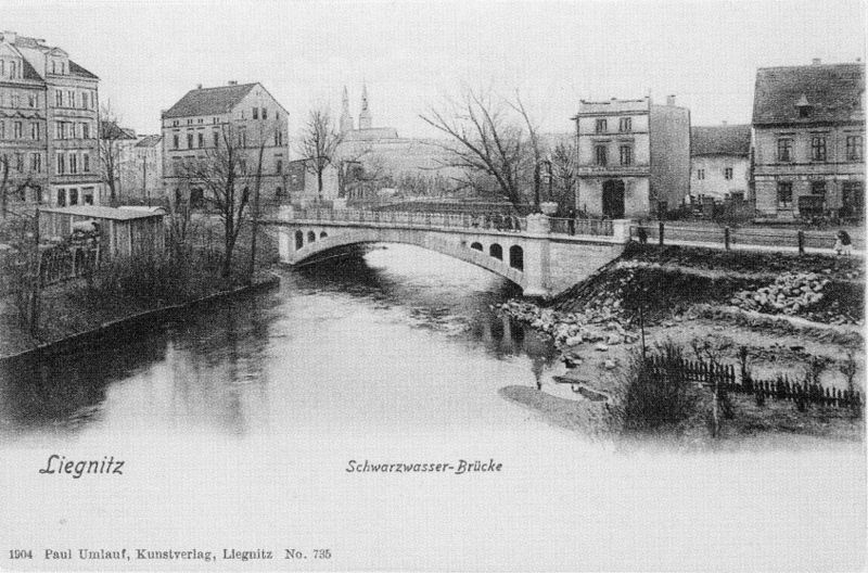 Tom II — ILUSTRACJE -- 110. Legnica. Głogowska — most na Czarnej Wodzie. Liegnitz. Schwarzwasser-Brücke. Karta pocztowa z pocz. XX w. Repr. z G. Humeńczuk, Legnica około 1900 roku, Legnica 2004, s. 105.