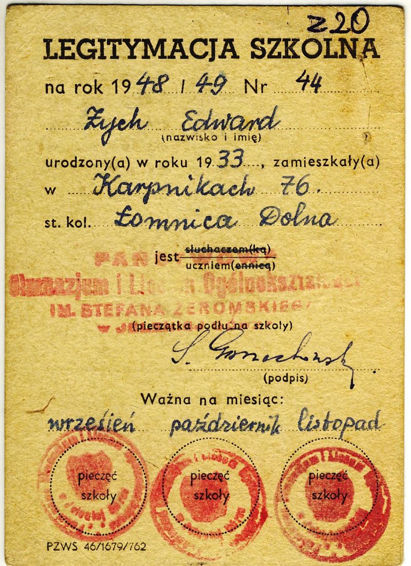 Edward Franciszek Zych urodził się 22 listopada 1931 r. w Cezarówce pow. tarnopolski. Jego rodzice, Piotr (1899-1969) i Julia z domu Pawłowska (1912-1999), pobrali się 16.11.1929 r. w Mikulińcach. Piotr był weteranem I wojny światowej oraz wojny polsko-bolszewickiej. 10 lutego 1940 r. rodzina została deportowana przez bolszewików i zesłana na Sybir. Edward Zych miał wtedy 8 lat. Rodzice, bojąc się, aby na zesłaniu nie został wzięty do wyniszczającej pracy, ukryli jego wiek, oświadczając, iż urodził się w 1933 r. i ta data widnieje na wielu dokumentach aż po lata dziewięćdziesiąte. Miejscem zesłania była Kuźnia nad rzeką Sisim w Kraju Krasnojarskim. Zych rozpoczął naukę w szkole rosyjskiej, a w domu rodzice dbali o polskie kształcenie. Po amnestii z 1941 r. Zychowie przenieśli się do kołchozu we wsi Czornaja Koma, a w 1942 r. do sowchozu Tołstoj Mys w rejonie Nowosiołowa. Mieszkali z inną polską rodziną, której dzieci Zych uczył j. polskiego z opracowanych przez siebie podręczników. Związek Patriotów Polskich otworzył w sowchozie popołudniową szkołę polską, do której młody Zych uczęszczał, kontynuując edukację w szkole rosyjskiej. W maju 1943 r. Piotr Zych został zmobilizowany do I Dywizji im. T. Kościuszki. W marcu 1946 r. rodzina Zychów wyjechała do Polski. Ze zdemobilizowanym ojcem spotkali się w Krośnie Odrzańskim, skąd udali się do Kotliny Jeleniogórskiej. W maju 1946 r. Zychowie zamieszkali w Karpnikach pod nr 76 (dziś ul. Nadrzeczna 3), w domu należącym wcześniej do wójta gminy Fischbach – Hermanna Mendego, pełnym dokumentów i książek. Wśród nich, a przede wszystkim wśród pozostałych tu mebli i wyposażenia, niemal nie zmienianego przez wszystkie lata powojenne, Edward Zych spędził całe swoje późniejsze życie. W 1947 r. ukończył Szkołę Powszechną w Karpnikach i dostał się do Liceum Ogólnokształcącego w Jeleniej Górze. Wyróżniał się zwłaszcza na lekcjach języka polskiego, gdzie Jego mistrzem był Józef Sykulski, który zaszczepił Mu miłość do literatury, szczególnie poezji. W 1951 r. zdał maturą pedagogiczną, a zaraz potem został powołany do półrocznej służby w 18 Brygadzie Służba Polsce, stacjonującej w Gdyni. Po zakończeniu otrzymał trzyletni nakaz pracy (z 28.06.1951 r.) w Szkole Podstawowej w Karpnikach, gdzie został aż do 3.08.1959 r. ucząc języka polskiego, rosyjskiego i historii, a także prowadząc bibliotekę szkolną.