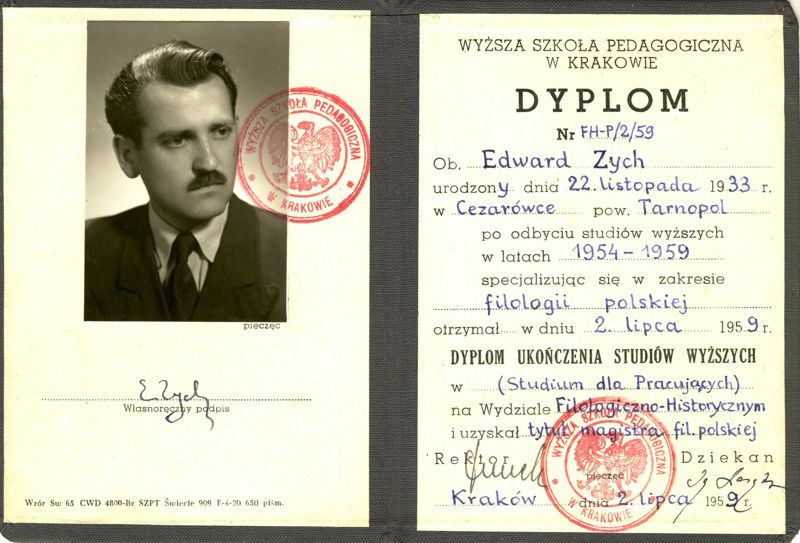 Edward Zych, choć był niezwykle odpowiedzialnym i oddanym pracownikiem, wolał działać „w drugiej linii’, nie dążąc do kierowniczych stanowisk. Wyrazem tego stało się zrzeczenie w kwietniu 1955 r. mandatu radnego Gromadzkiej Rady Narodowej w Karpnikach, gdzie pełnił funkcję Przewodniczącego Komisji Kultury, Oświaty i Zdrowia. Dwukrotnie rezygnował z kierowania szkołą. Po raz pierwszy pełnił obowiązki kierownika od 1.03.do 15.09.1952 r. i drugi od 15.01 do 31.12.1953 r. Za każdym razem nie chciał przyjąć stanowiska, argumentując, że jest nauczycielem początkującym, niedoświadczonym, nie posiadającym autorytetu i odpowiednich kwalifikacji. Pracując w Karpnikach w 1954 r. rozpoczął zaoczne studia polonistyczne w Wyższej Szkole Pedagogicznej w Krakowie. Studentem był pilnym, uzyskującym niemal ze wszystkich egzaminów oceny bardzo dobre. Tu zaczął interesować się nauką o nazwach, pisząc pracę magisterską z toponomastyki dolnośląskiej pt. Nazwy miejscowe powiatów zachodniośląskich – sudeckich. Promotorem był prof. dr Tadeusz Milewski. W 1959 r. uzyskał tytuł magistra filologii polskiej. Po studiach został nauczycielem w LO w Jeleniej Górze im. S. Żeromskiego, gdzie pracował jako polonista od 1.09.1959 do 31.08.1961 r. Następnie został przeniesiony do Szkoły Podstawowej w Karpnikach jako jej kierownik - posadę przyjął warunkowo na rok. Jak pisał: zastał szkołę niezwykle zaniedbaną w dziedzinie nauczania i pod innymi względami. Jako człowiek obowiązkowy podjął energiczne działania zmierzające do uzdrowienia sytuacji, co spotkało się z niezadowoleniem i oporem miejscowej społeczności, a nawet z jej wrogością. Ta sytuacja zmusiła Go do złożenia rezygnacji z etatu w Karpnikach i przeniesienia się do Technikum i Liceum Ekonomicznego w Jeleniej Górze, gdzie rozpoczął pracę 1.09.1962 r. jako nauczyciel języka polskiego i rosyjskiego. Z czasem został opiekunem szkolnej biblioteki, a w 1963 r. przeszedł całkowicie na etat bibliotekarza.