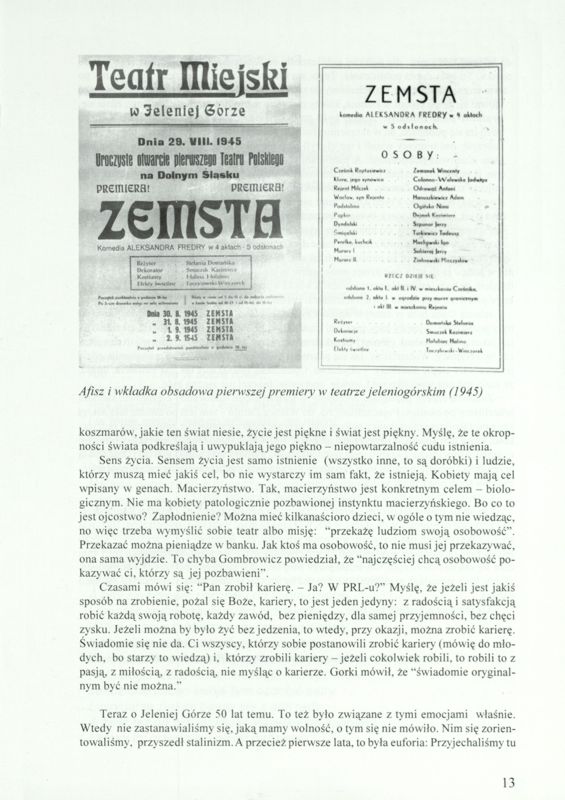 Otworzyliśmy teatr, uszyliśmy sobie ubrania z cienkich, przeraźliwie kolorowych bawełenek, które tu przechowywała przed bombami opera berlińska. A my byliśmy goli. Potem było jeszcze gorzej, bo weszliśmy do ciepłych jeszcze mieszkań niemieckich, które pachniały świeżą bielizną i ciepłymi konfiturami. (…) A potem otworzyliśmy teatr polski, w trzy miesiące po wojnie, tą samą rzeszowską „Zemstą”. Pierwszych kroków aktorskich uczyła nas z dużą czułością i talentem pedagogicznym – Stefania Domańska, A potem zabrał nam teatr Jerzy Walden – dzielny enkawudzista, jak sam się tym chwalił[2].