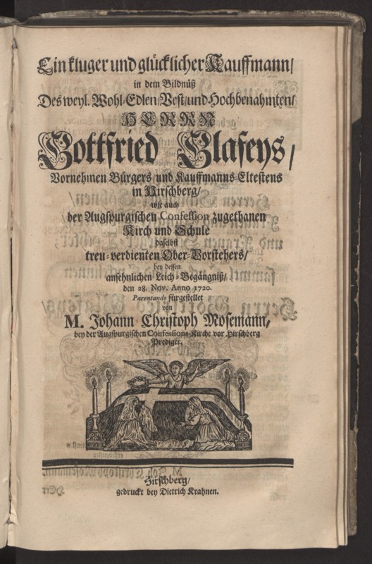Familie und Vorfahren Urkundlich wird der Name Glafey erstmals in einem in Glogau 1510 ausgestellten Kaufbrief erwähnt. Wahrscheinlich stammt die Familie ursprünglich aus dem fränkischen Claffheim, heute ein Stadtteil von Ansbach. So schrieb sich auch Gottfried Glafeys Onkel Adam (1634-1707) Glaffheim oder Klaffheim[1]. Die ältesten Hinweise über die Familie Glafey in Hirschberg finden sich in den dortigen Kirchenbüchern. 1685 erscheint hier der Todesfall von Gottfried Glafeyn´s Kind und 1690 der von Gottfried Claveiens Herr Vater. Er hieß Christian (*um 1635)[2]. Er hatte in der Breslauer Kirche St.-Maria-Magdalena 1655 Magdalena (1634-1662), geb. Mähner (Mehner), geheiratet[3] Christian Glafey, Gottfrieds Vater, war zum Zeitpunkt seiner ersten Heirat in Breslau noch Schuhmachergeselle. Vom Folgejahr 1656 an bis 1662 ist er als Handelsmann und Marktzieher (Händler), 1680 als Marktmeister bei der Waage und dem Leinwandhause und 1684 als Platzmeister bei der städtischen Niederlage in Breslau belegt[4]. Christians Vater, Adam Glaffe(i)n (*Winzig (Wińsko, um 1600), lebte ab 1661 in oder bei Hirschberg und ist in Schildau als Gärtner (Hof- und Kleingrundbesitzer) bezeugt[5]. Sein Sohn Christian stand wohl mit der Handlung von George Pohl (†1664),1658 Gründungsmitglied der Hirschberger Kauffmanns-Sozietät[6], in enger Verbindung und verkaufte Leinwaren über Breslau nach Polen. Lebenslauf Gottfried Glafeys Taufe erfolgte, einen Tag nach seiner Geburt, am 17.10.1656, vermutlich in der Breslauer Kirche St.-Maria-Magdalena[7]. Er war – laut der Leichenpredigt von Pfarrer Johann Neunhertz (1652-1737) – ein wohlgebildeter lieber Sohn und die Aufrichtigkeit selber. Weiter heißt es dort, alle Falschheit, List und Heucheley verabscheuete er, ob er sich schon damit einige Wiederwärtigkeit zuziehen sollte[8]. Von seinen Eltern erfuhr der junge Gottfried eine unermüdete und sorgfältige Erziehung. Sie unterwiesen ihn auch ausgiebig in der Religion. Seine weitere Ausbildung wurde Praeceptoribus (Hauslehrern) anvertraut. Sein Vater beförderte ihn zuletzte noch auf eine [der Stadt Breslau] benachbarte Polnische Schule, diese Sprache der Handlung halber zu erlernen. Schon in seinem 13. Lebensjahr, 1668/69, wurde Gottfried vor tüchtig gehalten, [ ] seine Schul-Jahre zu beschlissen und diejenige Lebens-Art sich zuerwehlen, in welcher er sein erhaltenes grosses Talent am besten anwenden könnte – nämlich den Kaufmannsberuf[9]. So wurde er zur Ausbildung in die Breslauer Handlung von Tobias Pohl (1629-1691)[10] und George Pohl (†1689) aufgenommen[11]. Dort zeichnete er sich in den ersten drei Jahren durch seinen Fleiß, Treue und besondere Geschicklichkeit aus. Danach führte er neun bis zehn Jahre die Hirschberger Filiale Tobias Pohls. Gegen 1682 riet ihm dieser, daneben auch was Eigenes mit anzufangen und sich nach und nach darbey selbst zu stabiliren (selbständig zu machen)[12]. Um dies zu verwirklichen, befand es Glafey für nöthig, [ ] sich nach einer getreuen Ehe-Gehülffin umzusehen[13]. Er heiratete am 8. September 1682 (Anna) Regina, (1665-1742), Tochter des reichen Hirschberger Kaufmanns Gottfried Baumgarten sen. (1626-1678). Das Paar hatte acht Töchter und fünf Söhne, von denen insgesamt neun das Erwachsenenalter erreichten. Als Gottfried starb, lebten noch zwei seiner Söhne und sechs seiner Töchter mit 29 Enkeln[14]. Seine Frau (Anna) Regina stand mit dem berühmten Professor und Theologen August Hermann Francke (1663-1727) in Halle in Briefwechsel. Nikolaus Ludwig, Graf von Zinzendorf (1700-1760), Gründer der Herrnhuter Gemeinde, besuchte sie etliche Male in ihrem Haus[15]. Sie führte nach dem Tod ihres Gatten gemeinsam mit ihren Söhnen die Geschäfte der Handlung fort[16]. 1683 trat Gottfried Glafey der Hirschberger Kauffmans-Societät bei[17]. 1696 wurde er unter ihre Ältesten aufgenommen und bald Besitzer eines austräglichen und hinlänglichen Vermögens.[18]. Gleich viermal leitete er als Ober-Ältester (Vorsitzender), 1699, 1707, 1714 und 1719, und dreimal als Neben-Ältester (dessen Stellvertreter), 1697, 1698 und 1706, die Geschicke der Hirschberger Kaufmannschaft an führender Stelle mit[19]. Es hieß von Glafey, daß Er so grosse Dinge in der Handlung gethan, und seinen Nahmen nicht nur in Deutschland, sondern auch in Holland, Engeland, Franckreich, Portugal, Italien und so weiter bekand gemacht habe.[20] Um 1700 hatte Glafey im späteren zeitweiligen Sitz des polnischen Staatsarchivs (ul. Podwale 27) eine Bleicherei und ein Leinenlager errichten lassen[21]. Hier gab er 1710 der neu errichteten evangelischen Schule für kurze Zeit Unterkunft. 1709 war das Glafeyische Hauß, bey der heil. Geist-Kirche als Bauplatz für die Gnadenkirche im Gespräch[22]. 1723 befand sich das Glafeysche Stammhaus in der Dunklen Burggasse (1944: Nr. 24)[7]. Zudem wurde Gottfried Glafey Erb- und Lehnsherr auf dem Rittergut Nieder-Stonsdorf (Staniszów)[23]. Glafey hatte sich Zeit seines Lebens bei den Vertretern der habsburgischen Herrschaft in Breslau und Wien unermüdlich für die Abmilderung der von ihr seit 1648 in Schlesien ausgeübten Unterdrückung seiner ev. Glaubensbrüder eingesetzt[24]. Pfarrer Neunhertz bezeichnete ihn als eine von denenjenigen Haupt-Personen, welche durch grossen Vorschuß und unermüdete Sorgfalt dazu beigetragen haben, die Errichtung von ev. Kirche, Schule und Friedhof höchst-glücklich zu Ende zu bringen[25]. Glafey erhielt bereits 1709 bei der Neuberufung des ev. Kirchenkollegiums das Amt eines Kirchen Ober-Vorstehers, das er bis zu seinem Tode innehatte. Er und Dr. Melchior Süßenbach wurden zudem vom Kirchenkollegium ausersehen, am 21. April 1709 den kaiserlichen Gesandten, Ludwig Graf und Herrn von Zinzendorf, und Pottendorf (1661-1742), der das kaiserliche Gnadenzeichen, eine Partisane, zur symbolischen Erlaubnis des Baus einer evangelischen Kirche und Schule in Hirschberg brachte, zu empfangen[26]. Fast neun Jahre später, am 9.