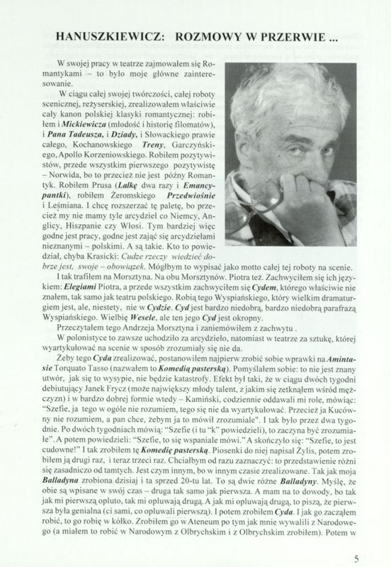 - Fot. 5. Adam Hanuszkiewicz bei einer Probe, 1997. Fot. Henryk Stobiecki. Archiv des Cyprian-Kamil-Norwid-Theaters in Jelenia Góra.
