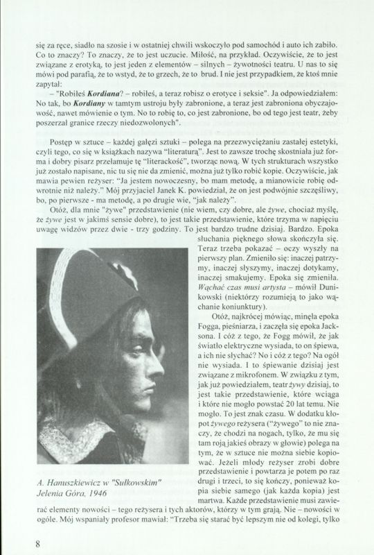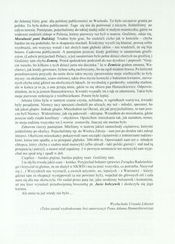 Wir haben ein Theater eröffnet, haben uns Kleider aus dünnem, ungemein buntem Baumwollstoff genäht, der hier von der Berliner Oper zum Schutz vor Bombenangriffen gelagert wurde. Und wir waren nackt. Danach kam es noch schlimmer, weil wir noch warme, behagliche deutsche Wohnungen betraten, die noch nach frischer Unterwäsche und warmer Konfitüre dufteten. (…) Danach haben wir drei Monate nach dem Krieg mit derselben "Rache"-Aufführung aus Rzeszów das polnische Theater eröffnet. Unsere ersten Schritte als Schauspieler brachte uns mit großer Fürsorge und pädagogischem Talent Stefania Domańska bei, später nahm uns das Theater Jerzy Walden - ein tapferer NKWD-Agent, wie er selber prahlte, weg