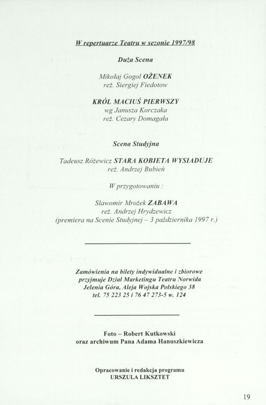- 1945: Die Rache (Aleksander Fredro) R. Stefania Domańska. Besetzung (Wacław). Stadttheater Jelenia Góra.