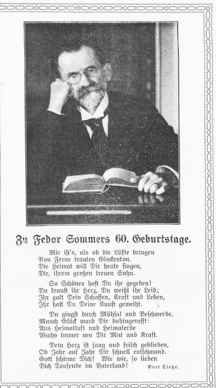 Fedor Sommer kam in Hohenfriedeberg (Dobromierz) in der Familie des Schlossermeisters Gustav Sommer im Haus in der Freiburger Straße 30 [heute Kościuszki Straße] auf die Welt. Fedors Vater bekam bald darauf eine Anstellung als Brückenzöllner in Nieder-Baumgarten (Sady Dolne). Dort zog die Familie in ein Zöllnerhaus ein, das auf dem Weg zwischen Hohenfriedeberg und Bolkenhain (Bolków) liegt und bis heute existiert. Der künftige Schriftsteller legte seit seinen frühesten Jugendjahren eine gewisse Persönlichkeitsambivalenz zutage: einerseits zeichnete er sich durch ein ausgeprägtes Verantwortungsbewusstsein, Diszipliniertheit und rationale Denkweise aus. Andererseits hatte er ein zutiefst romantisches Naturell, wie er in seinen Erinnerungen „Aus frühesten Jugendjahren” (1), schrieb. Er liebte es, sich auf dem Dachboden des Elternhauses zu verstecken und das schöne Stadtpanorama mit seinen hochaufragenden Kirchtürmen sowie den schönen grünen Gärten in sich aufzunehmen. Eine besondere Bedeutung bei diesen Kinderspielen hatte die unweit stehende breitkronige Linde, im deren Laubwerk der kleine Fedor sich gerne versteckte, um die ihm umgebende Welt zu beobachten. An dieser Stelle werden sofort Parallelen zu einem anderen berühmten Schlesier, Joseph von Eichendorff und seiner wunderschönen romantischen Novelle „Aus dem Leben eines Taugenichts” erkennbar. Mit Sicherheit war gerade die oben erwähnte Zwiespältigkeit seines Naturells der Grund dafür, dass Sommer in seinem Erwachsenenleben solch große Erfolge auf dem Gebiet der Didaktik und Jugenderziehung hatte, da er ein Lehrer war, den seinen Schüler mit Respekt und Zuneigung begegnete. Seine Ausbildung begann Fedor Sommer in Nieder-Baumgarten, wo er die acht Klassen der Volksschule besuchte. Daraufhin absolvierte er seine Ausbildung an der einer Schule die zum Lehrerberuf in Hohenfriedeberg vorbereitete. Nach Abschluss der Lehrerausbildung nahm er das dreijährige Studium der Pädagogik in Bunzlau (Bolesławiec) auf. Für den jungen Dichter war es eine Zeit der Erkundung der Welt, der Natur und der Ideen. Der junge Pädagoge wurde stark vom Pantheismus (Deus sive natura) nach Art Gustavs Theodors Fechners (1801-1887) sowie von den Ideen des Schweizer Pädagogen Johann Heinrich Pestalozzi (1746-1827) der einen antischolastischen Lehr- und Erziehungsansatz propagierte, beeinflusst: die Förderung physischer, sittlicher und intellektueller Attribute der Jugendlichen gleichermaßen mittels Anschauungsunterricht in der freien Natur und Wissenserlangung im Rahmen eigener Aktivität. In Anbetracht des preußischen Drills, der in den Schulen des Königsreichs Preußen und später des Kaiserreichs herrschte, war es offensichtlich, dass die romantischen und pantheistischen Neigungen von Sommer es verhinderten, dass er zum preußischen Pauker wurde, einer Figur, die später so häufig in der fortschrittlichen deutschen Literatur verspottet wurde. Wie es sich für einen romantisch geprägten Jüngling gehörte, liebte es Sommer zu reisen und zu beobachten. Unaufhörlich bildete er sich in vielen Wissenschaftsbereichen weiter und erlangte Wissen auf dem Gebiet der Geschichte, Geographie, Botanik und Geologie. Deswegen sind die Werke dieses Schriftstellers nicht nur unterhaltend, sondern auch lehrreich. Wenn wir über Goethe mit einer gewissen Ironie sagen können, dass nahezu jede seine Bekanntschaft mit einer schönen Frau in einem Dichterkunstwerk fruchtete, so ist bei Fedor Sommer festzustellen, dass er sein ganzes Leben seiner Ehefrau, der Apothekertochter aus Hohenfriedeberg, sowie dem Ort, in dem er lebte, treu geblieben ist. Es verwundert daher nicht weiter, dass sein erstes dichterisches Jugendwerk („Der Friede am Berge”) von Hohenfriedeberg und seiner Geschichte handelt. Hohenfriedeberg hatte für den Schriftsteller nicht nur eine besondere Bedeutung aufgrund der Tatsache, dass er hier geboren wurde, sondern auch deshalb, weil das Städtchen durch Friedrich den Großen, der hier im Jahre 1745 einen Sieg über die Armee Maria Theresias errungen hatte, bekannt gemacht wurde. Fedor Sommer war von der Gestalt Friedrichs des Großen fasziniert und widmete ihm Platz in einigen seiner Romane. ADie Handlungen der ersten Romane („In der Waldmühle” und „Ernst Reiland”) spielten an Orten seiner Kindheit und Jugend, was von seiner großen Faszination von der Heimatregion zeugte und zugleich eine eindringliche und kritische Analyse der gesellschaftlichen Zusammenhänge offenbarte. Diese literarische Manier sollte ihn bis zum Ende seines ungemein arbeitsamen Lebens begleiten. Seine literarische Karriere (manche seiner Romane haben bis zu sechs Neuauflagen gehabt) und seine Karriere als Lehrer (die von ihm geleitete Königliche Evangelische Präparandenanstalt in Striegau (Strzegom) erhielt im Jahre 1910 eine Goldmedaille auf der Weltausstellung in Brüssel) waren eng miteinander verflochten. Die Tatsache, dass Fedor Sommer als Lehrer und später als Schulleiter und Schulinspektor häufig von Ort zu Ort versetzt wurde, lässt sich heute nicht eindeutig beurteilen. Es ist möglich, dass er seinem romantischen Naturell folgend selber um Versetzung bat, um neue Orte kennenzulernen, oder aber die preußischen Bildungsbehörden ihn dorthin schickten, wo gerade seine Erfahrung und Fleiß benötigt waren. Seinen Pflichten als Lehrer, Schulleiter und Schulinspektor an verschiedene Orte Niederschlesiens (Münsterberg (Ziębice), Striegau (Strzegom), Schmiedeberg (Kowary) folgend, hat der Schriftsteller mit Ausnahme kurzer Aufenthalte in der Oberlausitz (Reichenbach, 1874-1877) und in Brandenburg (Gransee, 1921-22) die ganze Zeit die Geschichte, Geographie und Natur seiner Heimat studiert und ließ die Leser seiner Romane, aber auch seine Schüler, für die er Lehrbücher für schlesische Geschichte und schlesische Geographie schrieb, an seinem Wissen teilhaben. Seine letzten Berufsjahre verbrachte der Schriftsteller in Bolkenhain