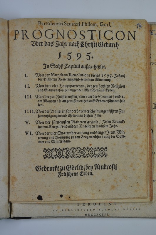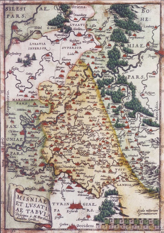 Kindheit und Jugend Bartholomäus Scultetus eigentlich Barthel Schultz (Scholz) wurde am 14.05.1540 in Görlitz (Zgorzelec) im Rabenvorwerk (gegenwärtig DPS Jutrzenka in Zgorzelec) geboren, was nach einiger Zeit Scultetus-Hof genannt wurde. Auf der Grünfläche vor den Behausungen (Straßenkreuzung der Straßen Przechodnia, Scultetusa und Żeromskiego) wurde im Jahre 1913 ein Gedenkstein angebracht. Scultetus stammte aus einer Bauernfamilie. Über seine Vorfahren ist wenig bekannt. Der Urgroßvater Nicolaus Schulze war Bauer in Leopoldshain bei Görlitz (Łagów k. Zgorzelca). Der Großvater Michael Schulz führte seit 1500 einen Bauernhof auf dem Rabenberg (Krucza Góra). Danach übernahm ihn der Vater von Bartholomäus, Martin Scholz (Schulz), der von 1467 bis 1558 lebte [2]. Die Mutter des künftigen Bürgermeisters, Ursula Eichler, stammte aus einer Bauernfamilie aus Görlitz Moys (Ujazd cz. Zgorzelca), sie starb im Jahre 1564. Bartholomäus hatte zwei Brüder: Zacharias (1530-1560) und Abraham (*1537). Der Ältere war der Baumeister der bis heute existierenden Sonnenuhr auf dem Gebäude der Rathsapotheke auf dem Untermarkt (Dolny Rynek) in Görlitz. Wie er in seinem Werk Gnomonice de solariis (1572) schrieb, bereite ihm Mathematik seit frühester Jugend das größte Vergnügen. Die Grundlagen wie auch die der Astronomie brachte ihm Zacharias bei, der vorzeitig verstorbene Polyglotte, der ihm auch die Werke von Oronteus Finaeus erklärte [3]. Die Ausbildung begann er in der lateinischen Schule in Görlitz [4]. Zu jener Zeit begann er die lateinische Form seines Vor- und Nachnamens, Bartholomaeus Scultetus, zu verwenden, was bei gebildeten Menschen jener Epoche häufig vorkam. Im Jahre 1559 ging er nach Leipzig, wo er bei Johannes Hommel [5]. Unterricht nehmen wollte. Dieser nahm ihn sogar bei sich zuhause auf, nachdem er sich mit seinen bisherigen Arbeiten vertraut machte. Der junge Student half ihm bei den Beobachtungen, Berechnungen und dem Bau von astronomischen Instrumenten. Nach dem Tod seines Mentors übernahm Scultetus sein Erbe und führte seine Arbeit fort. Zwei Jahre studierte er in Wittenberg, wo er im Jahre 1564 den Magistertitel erlangte, woraufhin er nach Leipzig zurückkehrte [6]. Hier lehrte er Mathematik, jedoch hatte er aufgrund seines jungen Alters keine Professur bekommen. Sein Schüler war u.a. Tycho Brahe [7], mit dem ihn eine langjährige Freundschaft verband. Familie Im Jahre 1567 kehrte Scultetus nach Görlitz zurück. 1570 heiratete er im Alter von 30 Jahren die 14 Jahre ältere Witwe Agnes Thiel (1526-72), die Tochter des Buchhändlers Thomas Winkler. Durch die Heirat wurde er Eigentümer des Hauses an der heutigen Peterstr. 4, wo er bis zu seinem Tode lebte. Heute befindet sich hier u.a. das Cafehaus Lucullus. Fehlender Nachwuchs muss wohl mit dem Alter der Ehefrau sowie ihrem frühem Tod erklärt werden. Bald darauf (26.1.1573 r.) heiratete Scultetus die viel jüngere Helene (1548-1623), die Tochter von Johann Röber. Aus dieser Ehe stammten sechs Kinder: drei Söhne, die sich Scholz [8] nannte, sowie drei Töchter [9]. Anfänge seiner Tätigkeit und Kontakte Nach der Rückkehr in seine Heimatstadt begann Scultetus sich u.a. mit der Erarbeitung einer Landkarte der Markgrafschaft Meißen zu beschäftigen. Im Jahre 1570 nahm er die Stelle des Hilfsrektors sowie des Lehrers für Arithmetik und der sphärischen Geometrie am Gymnasium Augustum an. Er setzte diese Arbeit bis 1584 fort und führte gleichzeitig astronomische Beobachtungen, korrespondierte und erfüllte sonstige Verpflichtungen. Aufgrund seines Wissens und der Ämter, die er inne hatte, war der Kreis der Menschen, mit denen er Kontakte pflegte, recht umfangreich. Neben den Einwohnern der Stadt und der Umgebung gehörten auch Wissenschaftler, Abgeordnete, Fürsten und gar der Papst und der Kaiser dazu. Im Jahre 1577 sprach er mit dem Kaiser Rudolf II [10] und seinen Brüdern Matthias [11] und Maximilian [12], die in Görlitz weilten. Er sollte Papst Gregor XIII. gekannt haben. Er unterhielt freundschaftliche Beziehungen mit Tycho Brahe und Johannes Kepler [13] der bei ihm 1607 zu Gast war. Im Jahre 1585 diskutierte er mit dem Rabbi Loewe [14], der in Görlitz einen Vortrag über die jüdische Art der Zeitmessung hielt. Er korrespondierte auch mit Caspar Peucer [15]. Im Jahre 1583 oder 1584 gelangte der Jesuit, Antonius Possevinus [16] nach Görlitz, der von Papst Gregor XIII. in der Angelegenheit der Kalenderreform nach Deutschland geschickt wurde. Er empfahl Scultetus den reformierten Kalender, der in Prag herausgegeben wurde. Ihn besuchte auch Christoph Clavius [17],von dem er eines der drei Exemplare seines Werks Novi Calendarii Romani apologia (1588) mit Widmung geschenkt bekam. Die anderen zwei Exemplare erhielten der Kaiser und der Kanzler des Reichs. Scultetus’ Zeitgenossen waren Jakob Böhme [18] und Caspar Schwenckfeldt [19], die er in den Kreis der Görlitzer Bürger aufnahm. Der Kartograf Scultetus wandte die Mathematik praktisch an und erstellte Landkarten auf Grundlage seiner notierten Feldmessungen und -beobachtungen. Im Jahre 1568 erschien in Görlitz die Landkarte der Markgrafschaft Meißen und Lausitz, die für den sächsischen Kurfürsten August von Sachsen erarbeitet wurde. Durch sie wurde er bekannt und geschätzt. Die in Görlitz in den Jahren 1577/78 weilende Moskauer Gesandtschaft versuchte ihn dazu zu überreden, die Stelle des Landvermessers und Kartografen beim Zaren Ivan dem Schrecklichen anzunehmen. In den 80er Jahren des 16. Jahrhunderts führte er Beobachtungen und Vermessungen im Gebiet der Oberlausitz durch. Als Ergebnis dieser Arbeiten erschien im Jahre 1593 im Auftrag der Oberlausitzer Stände eine ausgezeichnete Landkarte dieser Region. Über 200 Jahre lang konnte sich keine andere Landkarte mit ihr messen. Eine wichtige Komponente der Landkarte war die Darstellung der Grenze des Gebietes, das von der sorbischen Bevölkerung bewohnt war. Besonders genau wurde d