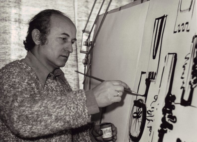 - Aleksander Puchała przy pracy, szkicujący projekty szkieł unikatowych, archiwum rodzinne