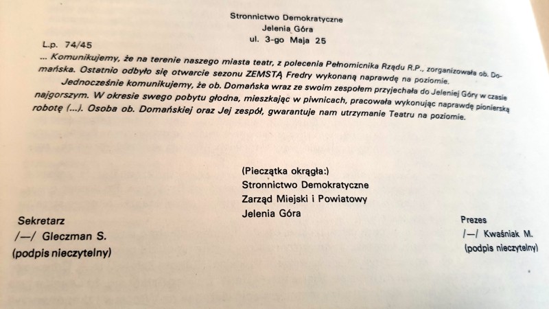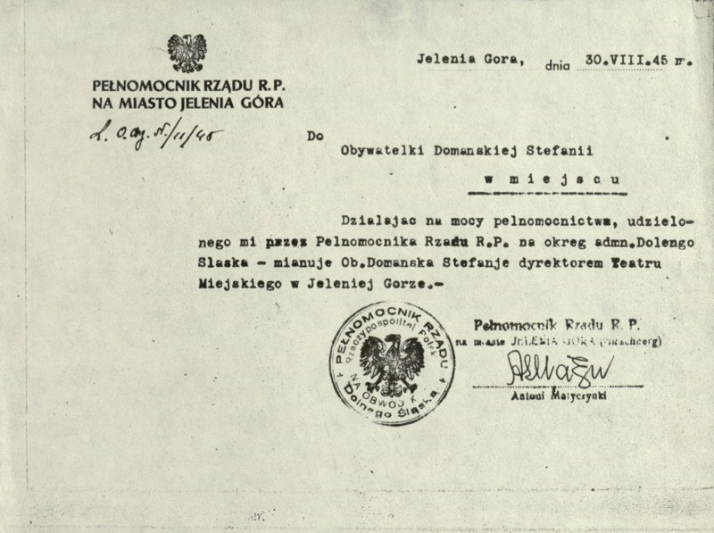 Domańska zaczęła więc reżyserować Zemstę na inaugurację działalności. Próby były już zaawansowane, kiedy między 10 a 15 sierpnia przyjechał do Jeleniej Góry kapitan Jerzy Walden z nominacją na dyrektora teatru. Zastał Domańską na scenie – było to przed próbą – i w krótkiej rozmowie oświadczył, że ma nominację na ten teatr. Zaraz potem wyjechał i wrócił 20 albo 21 sierpnia już z oficjalnym dokumentem Ministerstwa Kultury i Sztuki. Teatr miał zatem dwóch dyrektorów. 23 sierpnia 1945 r. w nowo otwartym teatrze odbyła się pierwsza premiera: Zemsta w reżyserii Stefanii Domańskiej w następującej obsadzie: W. Zemanek (Cześnik), J. Colonna-Walewska (Klara), A. Odrowąż (Rejent), A. Hanuszkiewicz (Wacław), N. Ogińska (Podstolina), K. Dejmek (Papkin), J. Szpunar (Dyndalski), T. Turkiewicz (Śmigalski), I. Machowski (Perełka), Jerzy Sobieraj (Murarz I), M. Ziobrowski (Murarz II). Przed spektaklem zespół muzyczny, złożony głównie z Niemców odegrał w rytmie wiedeńskiego walca Mazurka Dąbrowskiego. W wywiadzie, udzielonym miesięcznikowi „Teatr” (nr 10, 1988 r.) Stefania Domańska wspominała, że przed spektaklem premierowym, po pierwszym gongu, przed kurtynę, ubrany w płaszcz żołnierski, wyszedł Jerzy Walden i zameldował: Dostałem polecenie, żeby tu, na tych praziemiach, zorganizować teatr. (...) Melduję, że rozkaz został wykonany. Według dokumentów, ta sytuacja miała miejsce z okazji oficjalnego otwarcia teatru, to jest 29 sierpnia, kiedy z okazji zakończenia I Zjazdu Przemysłowego Ziem Odzyskanych odegrano Zemstę. 30 sierpnia Stefania Domańska otrzymała nominację na dyrektora Teatru Miejskiego w Jeleniej Górze, podpisaną przez pełnomocnika rządu R.P. na miasto Jelenia Góra. Pełniła tę funkcję do 30 września 1945 r. 29 września odbyła się premiera Gdzie diabeł nie może w jej reżyserii. W październiku nastąpiło oficjalne otwarcie – już pod nazwą – Wojewódzkiego Teatru Dolnośląskiego. Koncert powitalny w wykonaniu członków zespołu odbył się 18 października (konferansjerkę prowadził J. Walden). Jeszcze przed ustąpieniem miejsca dyrektorskiego Jerzemu Waldenowi, Stefania Domańska udzieliła wywiadu „Głosowi Pogranicza”, w którym sformułowała swój program dyrektora Teatru Miejskiego w Jeleniej Górze:
