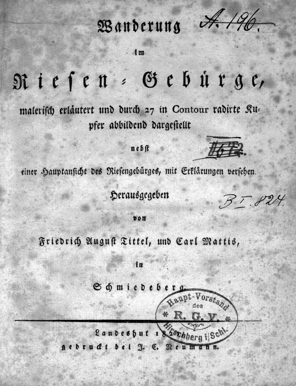 - Album 28 grafik z przewodnikiem Wanderung im Riesen=Gebuerge, malerisch erlaeutert und durch 27 in Contour radirte Kupfer abbildend dargestellt nebst einer Hauptansicht des Riesengebuerges, mit Erklaerungen versehen. [autor tekstu pastor Heyne] autor grafik F. A. Tittel wydawcy: Friedrich August Tittel i Carl Mattis, w Kowarach, druk Kamienna Góra 1821; właściciel: Muzeum Karkonoskie w Jeleniej Górze