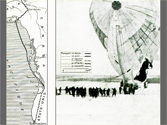 27 Przelot Amudsena na Biegunem Północnym. "Norge" ląduje w Teller. Podczas lądowania ulega uszkodzeniu. Po demontażu zostaje przewieziony do Włoch. Obok trasa transportu "Norge"