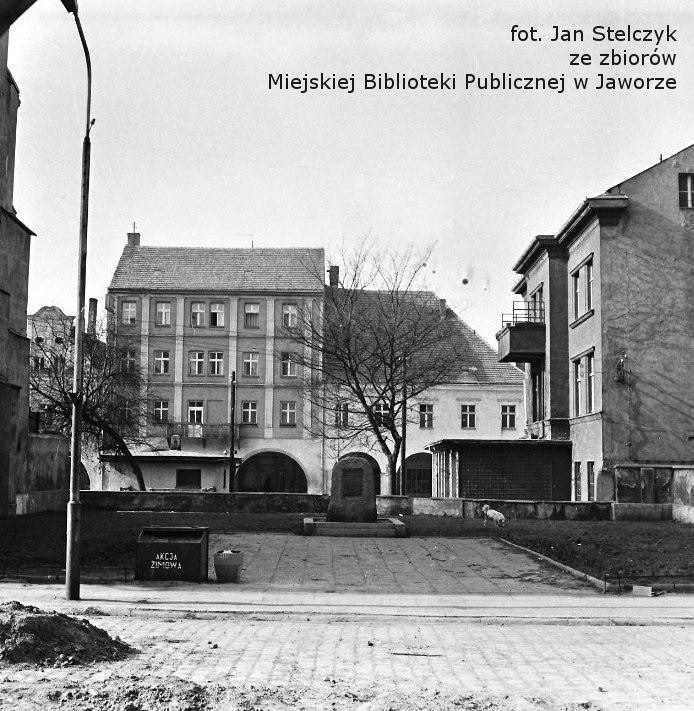 Widok na pomnik upamiętniający tysiąclecie państwa polskiego oraz zwycięstwo nad faszyzmem ufundowany przez mieszkańców Jawora w 1966 roku. W tle widoczna wschodnia część pierzei południowej, a po prawej stronie fragment budynku teatru.