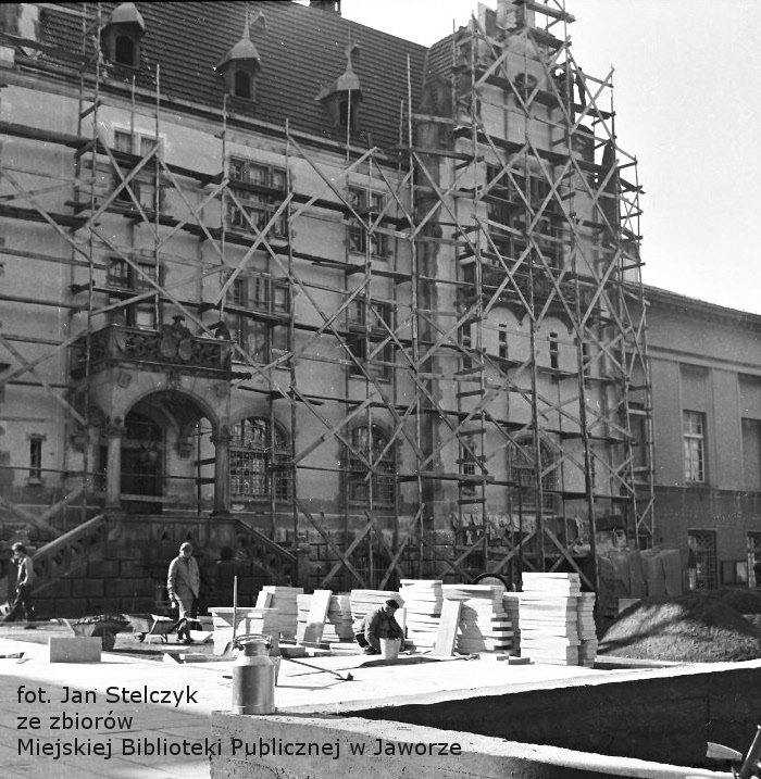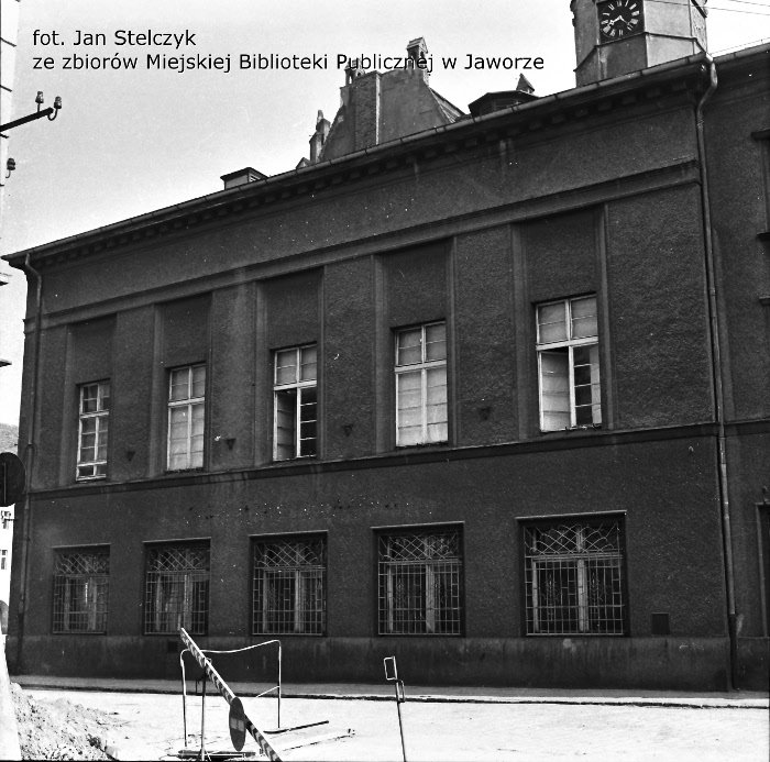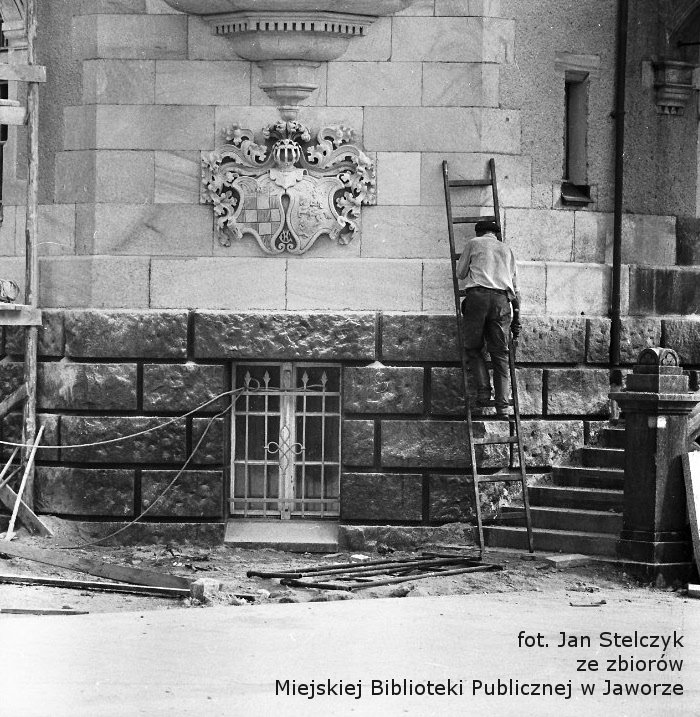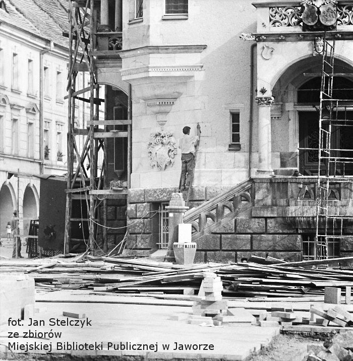 Widok na ratusz od strony północno-zachodniej. Widoczny herb Jawora.