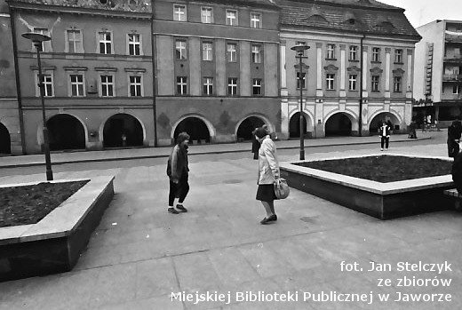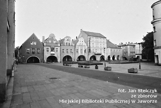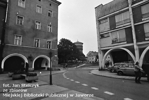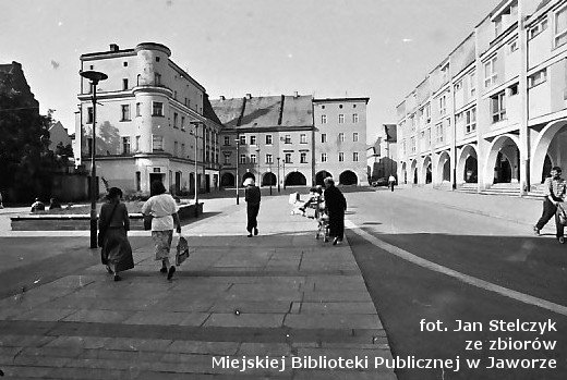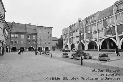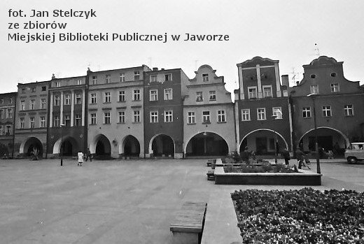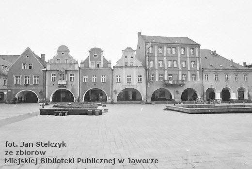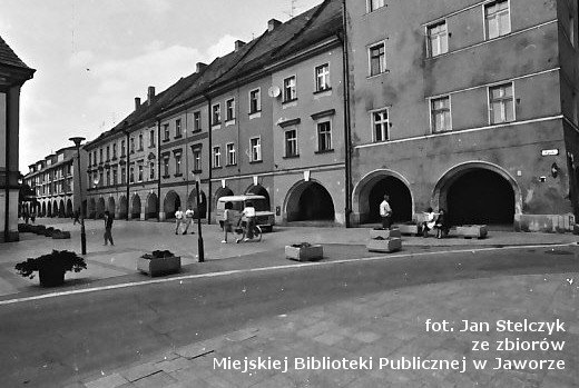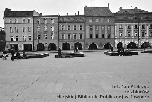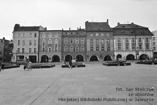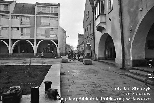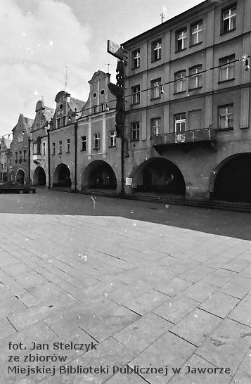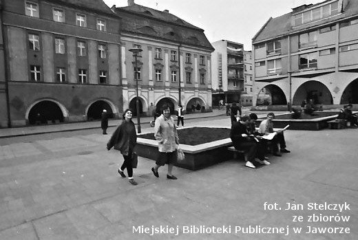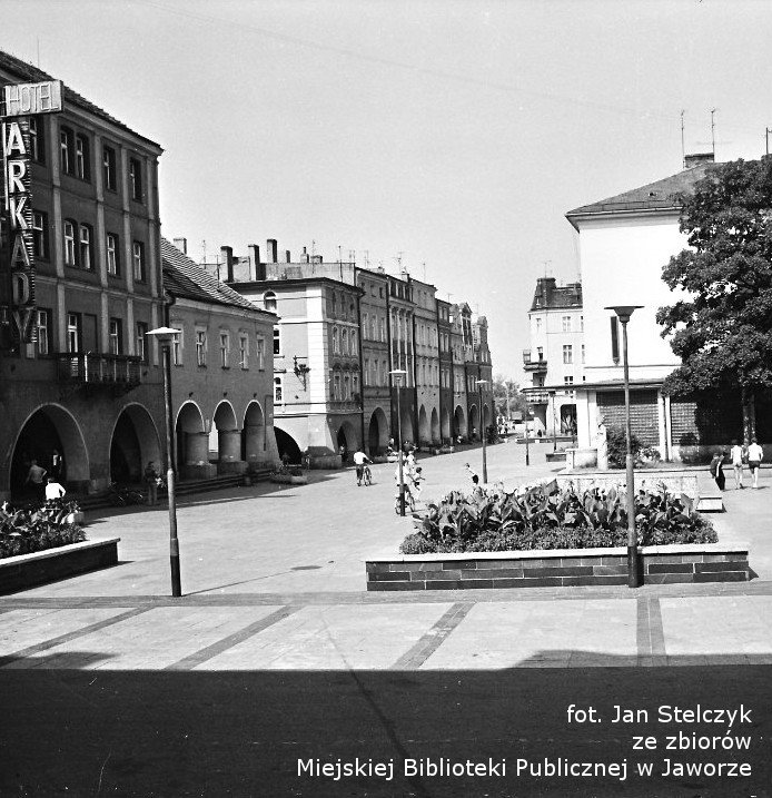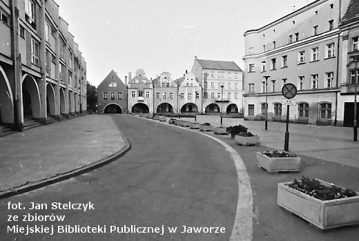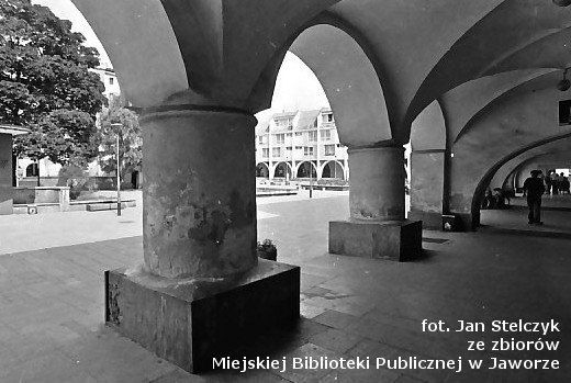 Widok na przejście śródrynkowe oraz pomnik upamiętniający tysiąclecie państwa polskiego oraz zwycięstwo nad faszyzmem ufundowany przez mieszkańców Jawora w roku 1966. Po lewej stronie budynki zabudowy śródrynkowej, a po prawej - fragment ratusza i budynku teatru. W tle widoczny fragment wschodniej części pierzei południowej.