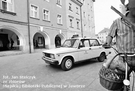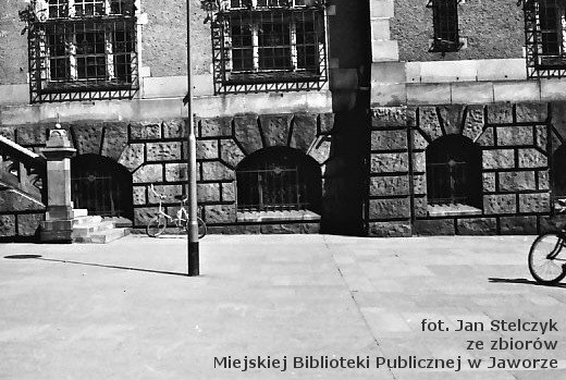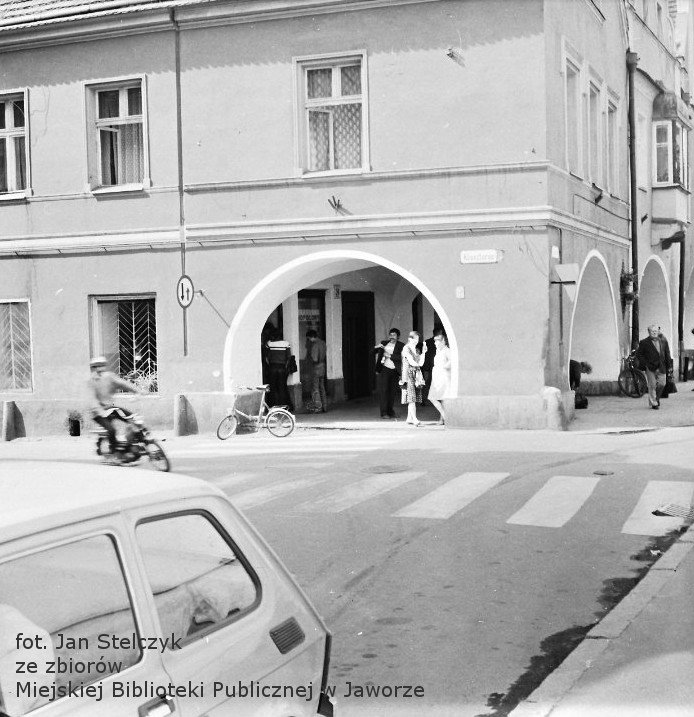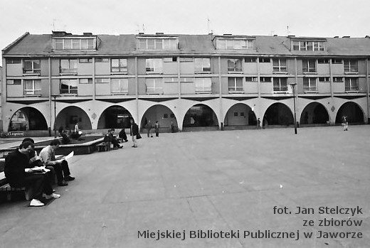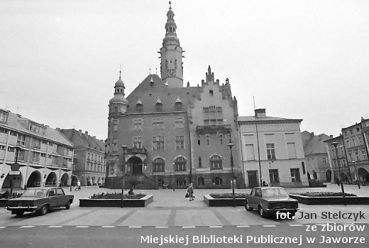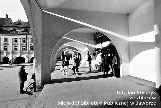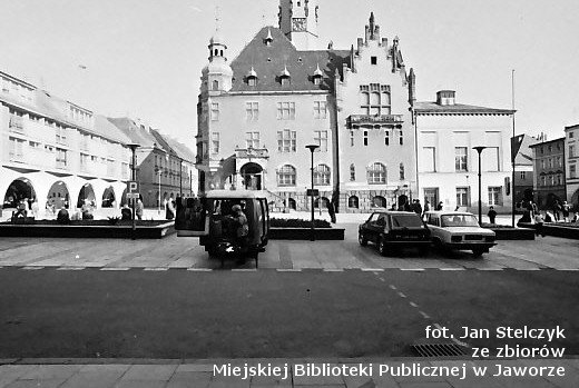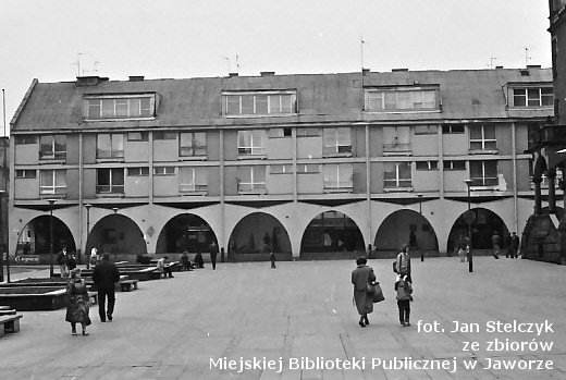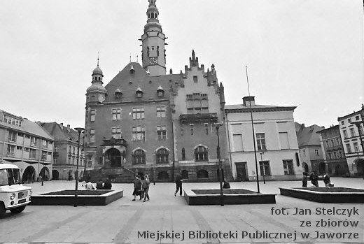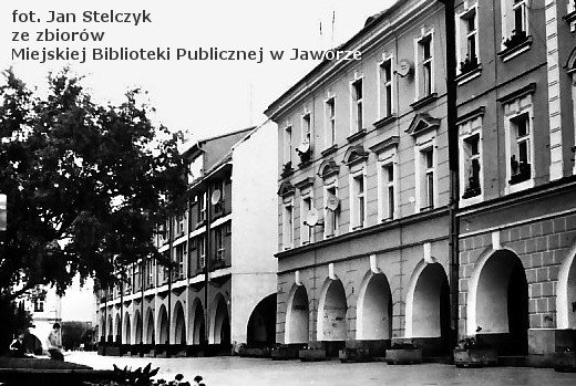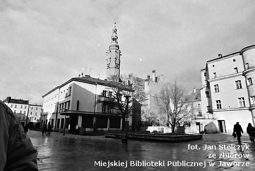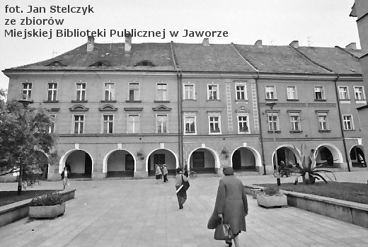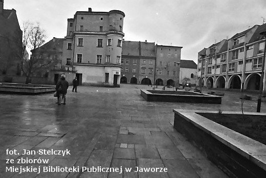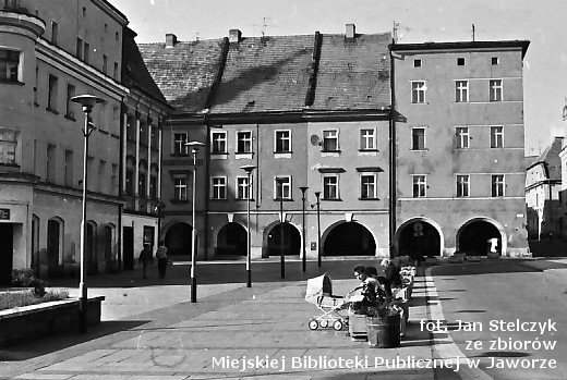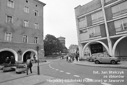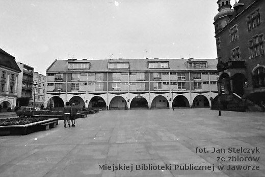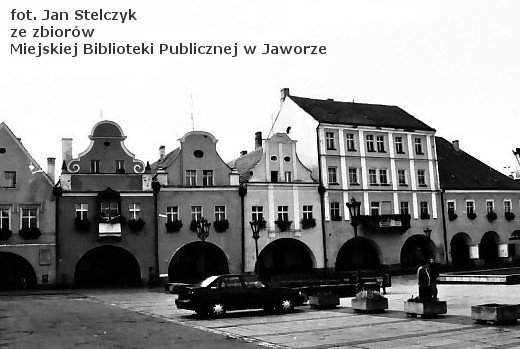 Widok na przejście śródrynkowe oraz pomnik upamiętniający tysiąclecie państwa polskiego oraz zwycięstwo nad faszyzmem ufundowany przez mieszkańców Jawora w roku 1966. Po lewej stronie budynki zabudowy śródrynkowej, a po prawej - fragment ratusza i budynku teatru. W tle widoczny fragment wschodniej części pierzei południowej.