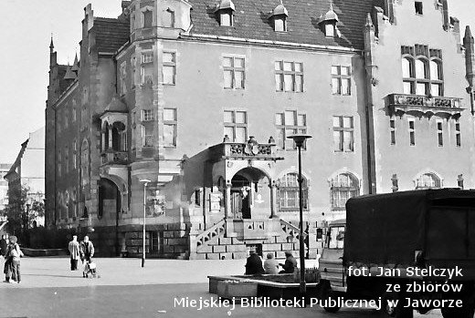 Widok na ratusz od strony ulicy Chrobrego. Po prawej stronie widoczny fragment teatru miejskiego. Widoczne także fragment zachodniej części pierzei północnej i balkony narożnej kamienicy pierzei zachodniej.
