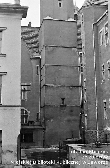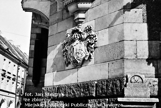 Widok na najstarszy herb Jawora umieszczony na ścianie wieży od strony wschodniej.