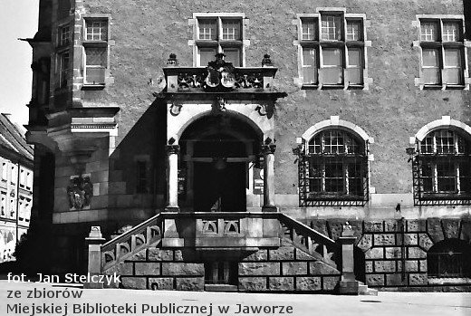 Widok na herb Jawora znajdujący się na północno-zachodnim norożniku ratusza.