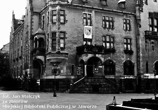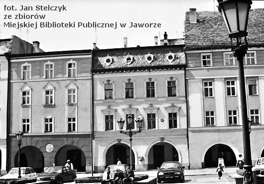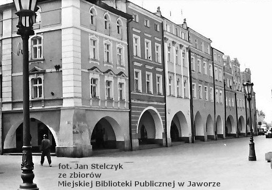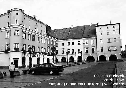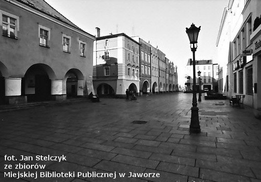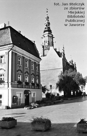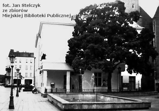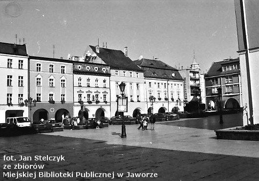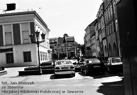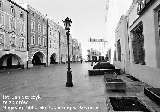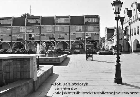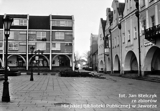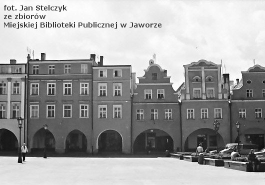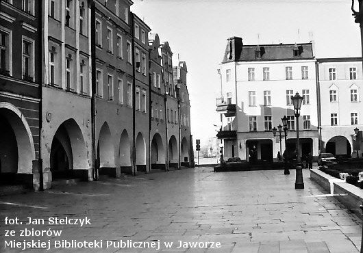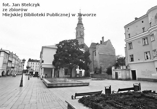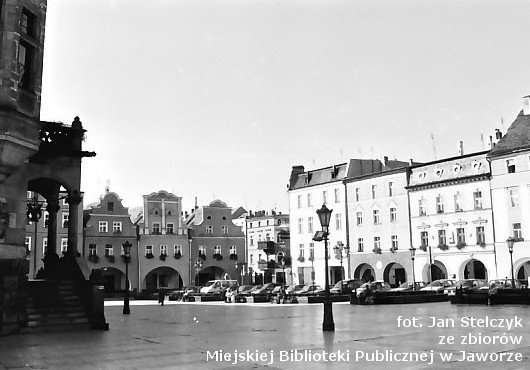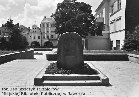 Widok na pomnik upamiętniający tysiąclecie państwa polskiego oraz zwycięstwo nad faszyzmem ufundowany przez mieszkańców Jawora w 1966 roku. Po prawej stronie widoczny fragment budynku teatru, a w tle - wschodnia część pierzei południowej.