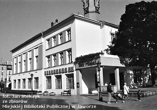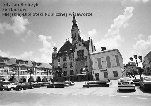 Widok na ratusz od strony południowo-zachodniej. Po prawej stronie widoczny fragment budynku teatru, a po lewej w tle - fragment zachodniej części pierzei północnej.