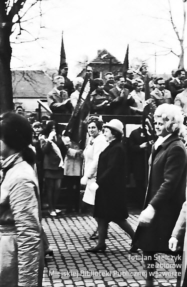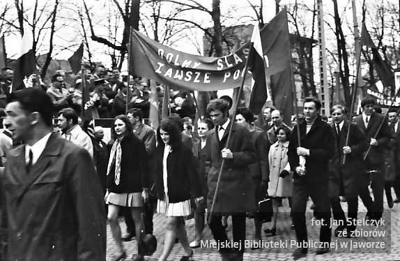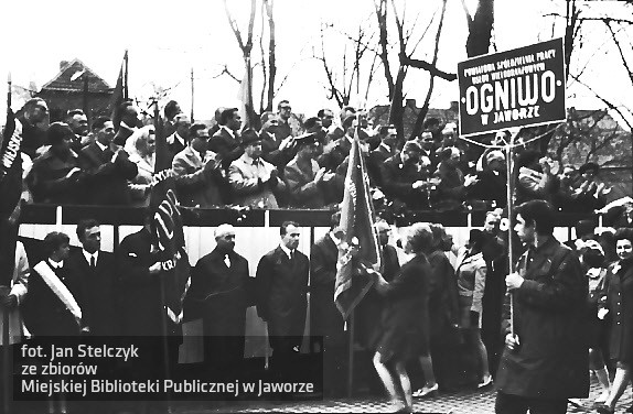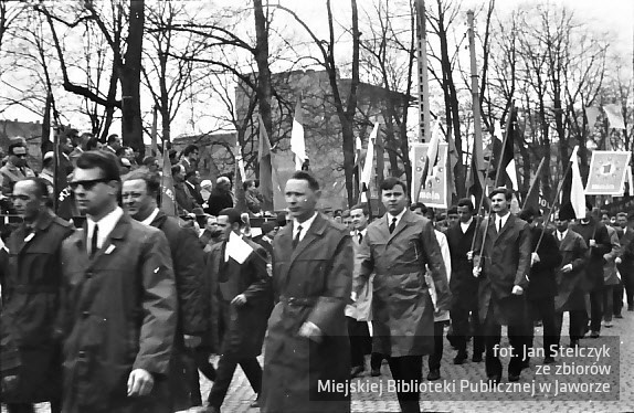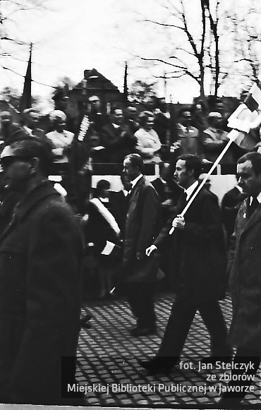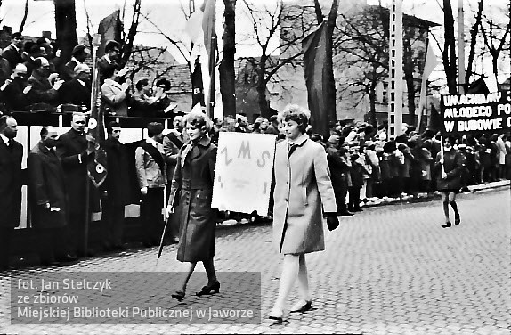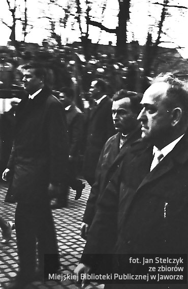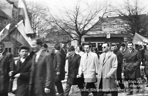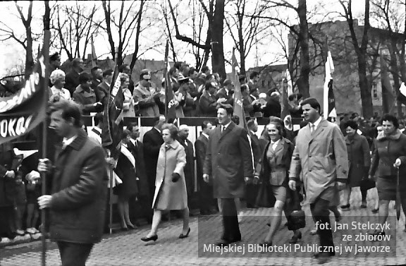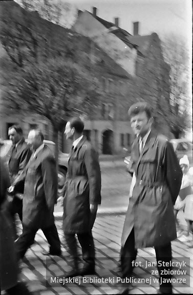 16 1 maja 1970 Jawor, ul. Wrocławska Obchody 1 maja - Święto Pracy Uczestnicy pochodu zmierzający przed trybunę honorową. Na pierwszym planie po prawej stronie:…