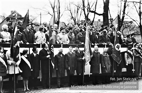 15 1 maja 1970 Jawor, ul. Wrocławska Obchody 1 maja - Święto Pracy Uczestnicy pochodu prezentujący się przed trybuną honorową. Przedstawiciele Związku Młodzieży…