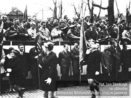 13 1 maja 1970 Jawor, ul. Wrocławska Obchody 1 maja - Święto Pracy Uczestnicy pochodu prezentujący się przed trybuną honorową. Przedstawiciele Związku Młodzieży…