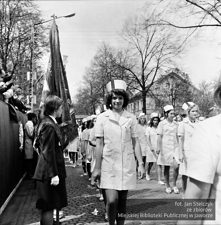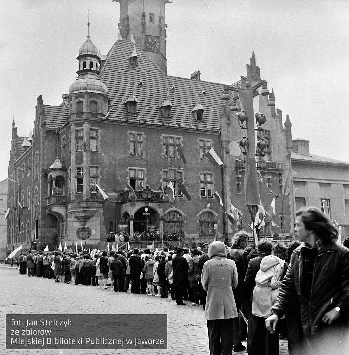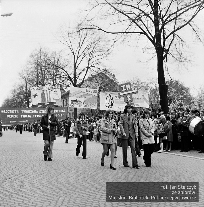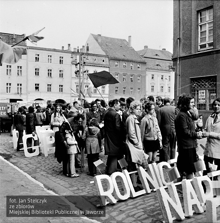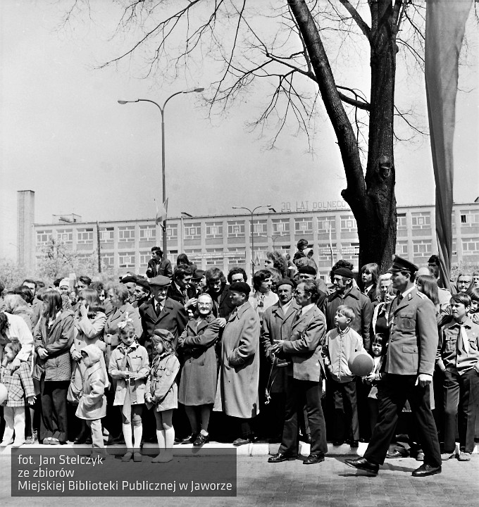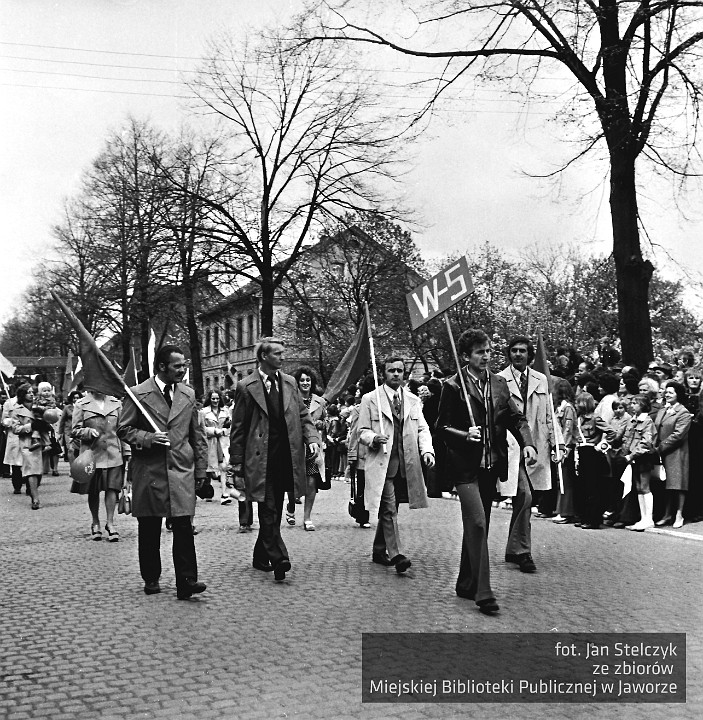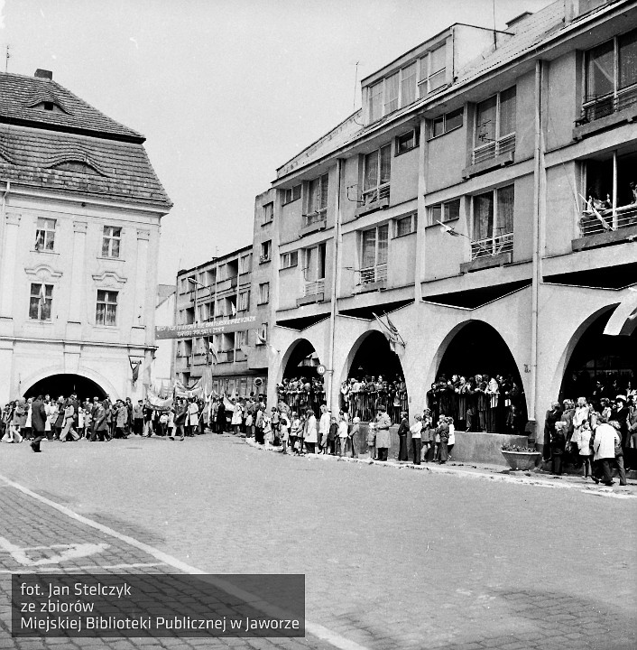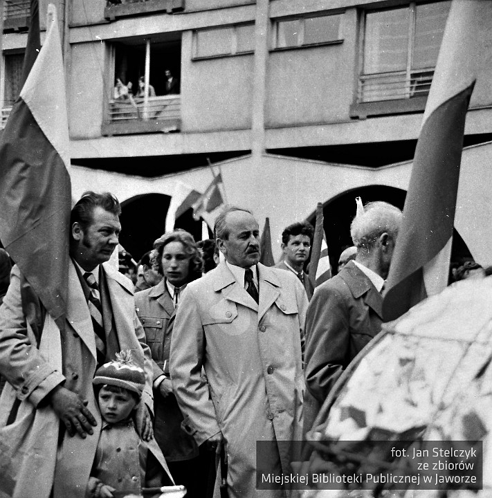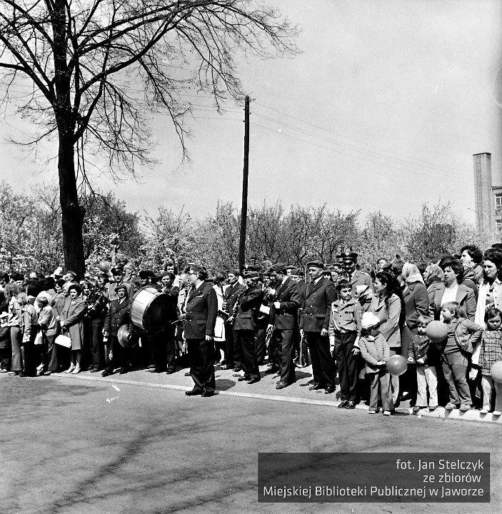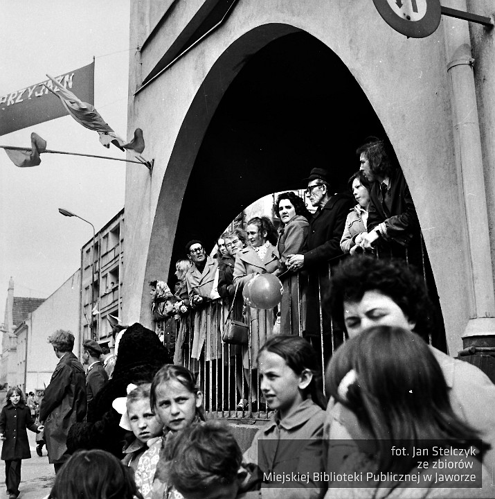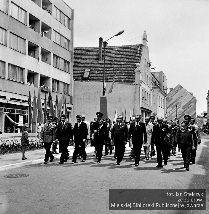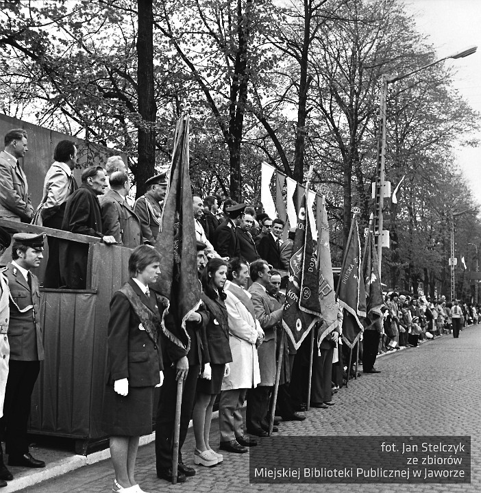 20 1 maja 1975 Jawor, ul. Józefa Poniatowskiego Obchody 1 maja - Święto Pracy Uczestnicy pochodu zmierzający w kierunku trybuny honorowej. Przedstawiciele…