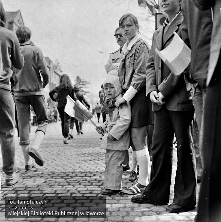 10 1 maja 1976 Jawor, ul. Wrocławska Obchody 1 maja - Święto Pracy Mieszkańcy zgromadzeni wzdłuż trasy pochodu pierwszomajowego w pobliżu trybuny honorowej. Na…