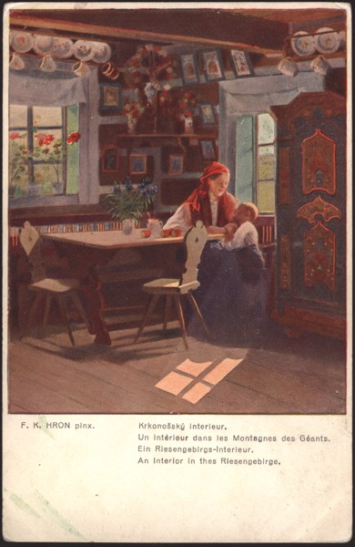 Description:A: Il. wielob. marg. wk., na dolnym marg. tytuł: Ein Riesengebirgs-Interieur. również w in. jęz., napis: F. K. Hron pinx. ; R: Wydaw., znak wydaw., sygn.: 218, linie adresowe ; Papier ; 140x90 ; Widokówka czysta