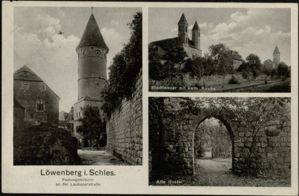 Description:A: 3 Fot. cz.-b., marg. wk., pod il. napisy: 1. Festunstorturm an der Laubanerstrasse, 2. Stadtmauer mit kath. Kirche, 3. Alte Bastei ; R: Wydaw., sygn. Lö.22., linie adresowe (czar.), znaczek 6 pf., stempel: Löwenberg (Schlesien) 20.7.32. 18-19; widok. zapisana czarnym atramentem w j. niem. ; 140x91 mm ; Widokówka z obiegu